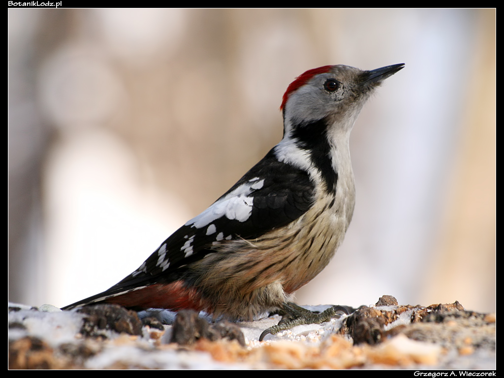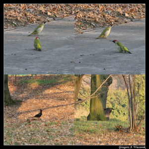 Co jeszcze udało mi się odnaleźć? Przede wszystkim dzięcioły. W Botaniku bardzo popularny jest dzięcioł zielony (Picus viridis), który często buszuje w trawie, biega po alejkach i nie jest przesadnie płochliwy. Dwa bardziej związane z drzewami gatunki – dzięcioł średni (Dendrocoptes medius) oraz dzięcioł duży (Dendrocopos major) – są trudniejsze do obserwowania. Dają znać o sobie przede wszystkim bębnieniem w drzewo. Kierując się tym odgłosem można spróbować zlokalizować je optycznie. Rzadko schodzą niżej, ale karmniki w czasie zimy są dobrym miejscem na zrobienie im zdjęcia. Wreszcie największy gatunek – dzięcioł czarny (Dryocopus martius). Ubarwiony w całości na czarno, z czerwoną czapeczką, jest bardzo łatwy do identyfikacji. W Ogrodzie widziałem go może z dwa razy w życiu, w jednym przypadku udało się zrobić słabe zdjęcia z daleka.