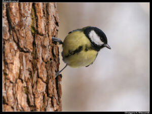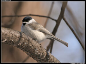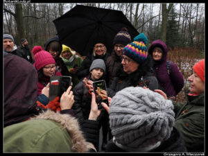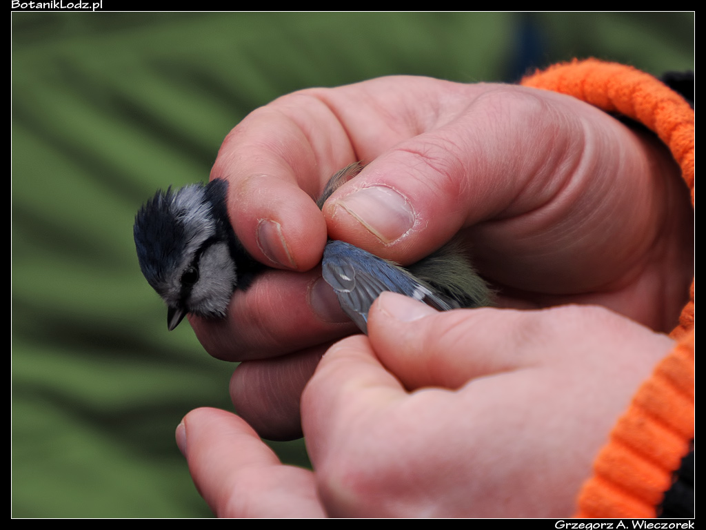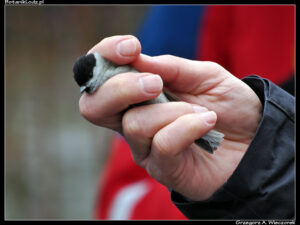 Mimo niesprzyjających warunków atmosferycznych, na miejscu zbiórki stawiła się pokaźna grupa osób – było ich na pewno powyżej trzydziestu. Wśród nich część stanowili typowi spacerowicze, ale było też sporo osób mocno zainteresowanych ptakami, o czym świadczyły imponujące teleobiektywy oraz lornetki. Po krótkim wstępie zaczęliśmy od mocnego uderzenia, czyli obejrzenia złapanych wcześniej sikor. Panowie ornitolodzy prezentowali te ptaki trzymając je w dłoni, prostując im skrzydełka i opowiadając o nich wiele ciekawych rzeczy. Chociaż wiele osób widziało już zapewne podobne zabiegi, dla mnie była to zupełna nowość. Duże wrażenie robi na mnie zawsze spotkanie profesjonalisty, który potrafi tak trzymać ważkę, żeby jej nie uszkodzić, a potem wypuszcza ją i owad swobodnie odlatuje. Z sikorami było podobnie. Po oględzinach i sesji zdjęciowej zostały wypuszczone i z pobliskiej gałęzi wyćwierkały co o nas sądzą. Chociaż oczywiście nieco przesadzam, bo te ptaki nie ćwierkają.