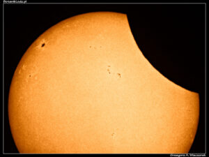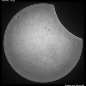 Zaćmienia Słońca nie są wcale tak rzadkie, jak to się większości ludzi wydaje. Mówię oczywiście o widocznych z terenu naszego kraju zaćmieniach częściowych, bo całkowite to zupełnie inna historia. Dość powiedzieć, że w samym tylko XXI wieku mieliśmy już dziesięć wydarzeń tego rodzaju. Kolejne z nich będzie miało miejsce 12 sierpnia 2026 roku i warto na nie zwrócić uwagę. Będzie to zaćmienie całkowite widoczne w Europie, a konkretnie w Hiszpanii, jeżeli więc ktoś planuje wakacje w tym kraju, warto połączyć przyjemne z pożytecznym. Wracając jednak do dnia dzisiejszego. Pogoda dopisała, zjawisko można było fotografować bez większych problemów. Przy tej okazji jak zawsze przypomnienie – nigdy nie należy patrzeć bezpośrednio na Słońce, bez odpowiedniego filtra. Jak mówi stare przysłowie – na Słońce przez teleskop bez osłony można spojrzeć dwa razy – raz lewym okiem, raz prawym. Ja zdjęcia robiłem tradycyjnie przez folię Baadera, co jest rozwiązaniem bardzo tanim, ale w zupełności wystarczającym. W Łodzi Księżyc zasłonił w maksimum 16,8% tarczy naszej gwiazdy. Nie jest to może bardzo dużo, ale zaćmienie to zawsze zaćmienie i warto było je zobaczyć i sfotografować po raz kolejny.