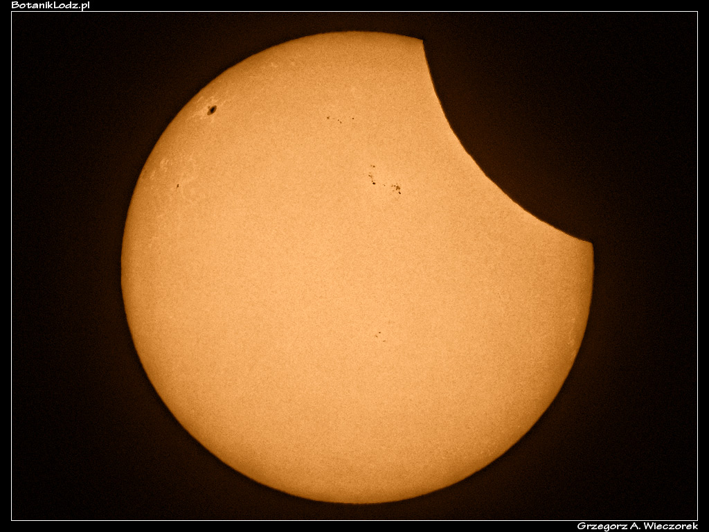 Zaćmienia Słońca nie są wcale tak rzadkie, jak to się większości ludzi wydaje. Mówię oczywiście o widocznych z terenu naszego kraju zaćmieniach częściowych, bo całkowite to zupełnie inna historia. Dość powiedzieć, że w samym tylko XXI wieku mieliśmy już dziesięć wydarzeń tego rodzaju. Kolejne z nich będzie miało miejsce 12 sierpnia 2026 roku i warto na nie zwrócić uwagę. Będzie to zaćmienie całkowite widoczne w Europie, a konkretnie w Hiszpanii, jeżeli więc ktoś planuje wakacje w tym kraju, warto połączyć przyjemne z pożytecznym. Wracając jednak do dnia dzisiejszego. Pogoda dopisała, zjawisko można było fotografować bez większych problemów. Przy tej okazji jak zawsze przypomnienie – nigdy nie należy patrzeć bezpośrednio na Słońce, bez odpowiedniego filtra. Jak mówi stare przysłowie – na Słońce przez teleskop bez osłony można spojrzeć dwa razy – raz lewym okiem, raz prawym. Ja zdjęcia robiłem tradycyjnie przez folię Baadera, co jest rozwiązaniem bardzo tanim, ale w zupełności wystarczającym. W Łodzi Księżyc zasłonił w maksimum 16,8% tarczy naszej gwiazdy. Nie jest to może bardzo dużo, ale zaćmienie to zawsze zaćmienie i warto było je zobaczyć i sfotografować po raz kolejny.