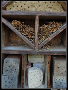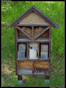 Na koniec dzisiejszego wpisu wracamy jeszcze do domków dla owadów. Okazało się, że podczas ostatniej inwentaryzacji udało mi się jeden przegapić. Domek numer dziesięć położony jest na trawniku, na skraju lasu sąsiadującego z sadem i skansenem. W niewielkiej odległości od niego znajdują się kwitnące jabłonie, rabaty z różnymi roślinami kwitnącymi wczesną wiosną oraz kwietny ogród położony przy skansenowej chałupie. W domku możemy zobaczyć dużą różnorodność materiałów. Jest glina, są trzcinowe rurki, niżej drewniane klocki i nawiercone pustaki. Na samym dole resztki rdestowych rurek o bardzo dużej średnicy. Jeszcze nie widziałem, żeby jakikolwiek owad budował w nich gniazda, ale to wcale nie znaczy, że są zbędne. Duża średnica sprawia, że w nocy czy w czasie złej pogody mogą w nich szukać schronienia całkiem duże owady. Niestety, mimo dostępu do źródeł różnorodnego pokarmu, domek nie wygląda na gęsto zasiedlony. Być może przyczyną jest to, przez część dnia znajduje się w cieniu? I to już chyba ostatni z domków, mam nadzieję, że nie przeoczyłem żadnego więcej. W kolejnych sezonach będę starał się je systematycznie obserwować i może nawet wyciągnąć z tych obserwacji jakieś sensowne wnioski.