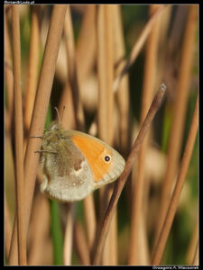 A skoro mowa o innych owadach – cóż jeszcze można było spotkać w czasie wiosennych spacerów? Niestety, niewiele. Poza standardowym zestawem złożonym z cytrynków, rusałek i kowali bezskrzydłych owadów jest niewiele. Udało się spotkać strzępotka ruczajnika (Coenonympha pamphilus), który ładnie zapozował wśród zeszłorocznych trzcin. Bardziej aktywne stały się klecanki rdzaworożne (Polistes dominula) gnieżdżące się w kilku domkach dla owadów w przestrzeni pod ich sufitami. Koło samych domków lata nieco innych błonkówek i pasożytniczych muchówek, jest ich jednak nadal niewiele. Kapryśna pogoda sprawia, że owady wciąż nie są tak aktywne, jak w poprzednich, cieplejszych sezonach.
