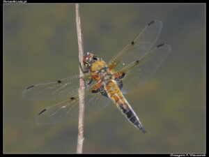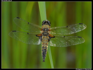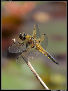 Następna na liście jest ważka czteroplama (Libellula quadrimaculata) należąca do podrzędu różnoskrzydłych. Te sporej wielkości owady występują w Ogrodzie powszechnie i są widoczne właściwie w każdym sezonie, w okolicach większości stawów. Na pierwszy rzut oka nie wyglądają tak atrakcyjnie jak gatunki ubarwione na niebiesko czy czerwono – z daleka są po prostu brązowawe, co pozwala im dobrze wtapiać się w trzcinowe tło. Zyskują na zdjęciach maro. Ich tułów mieni się wtedy różnymi odcieniami bursztynu, a labirynt żyłek na skrzydełkach jest prawdziwym majstersztykiem natury. Ważki te mają również inną zaletę – często siadują na ułamanych, samotnych roślinach wodnych. Pozwala im to doskonale kontrolować teren, przepędzać z niego intruzów i z daleka dostrzegać potencjalną zdobycz. Z kolei dla miłośnika fotografii jest to sytuacja idealna – ważka jest doskonale wyizolowana z tła, a przy tym można ją obejrzeć i z góry, i z profilu. Ważki czteroplame pojawiły się także w tym roku, chociaż – podobnie jak i innych owadów – jest ich zdecydowanie mniej.