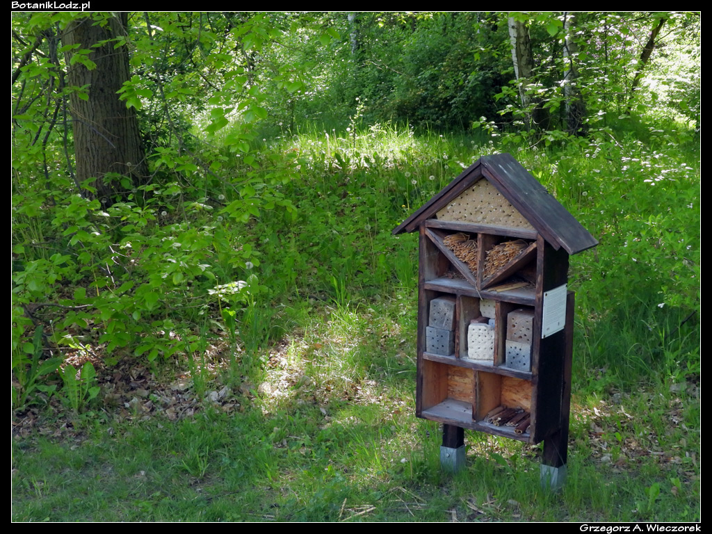 Na koniec dzisiejszego wpisu wracamy jeszcze do domków dla owadów. Okazało się, że podczas ostatniej inwentaryzacji udało mi się jeden przegapić. Domek numer dziesięć położony jest na trawniku, na skraju lasu sąsiadującego z sadem i skansenem. W niewielkiej odległości od niego znajdują się kwitnące jabłonie, rabaty z różnymi roślinami kwitnącymi wczesną wiosną oraz kwietny ogród położony przy skansenowej chałupie. W domku możemy zobaczyć dużą różnorodność materiałów. Jest glina, są trzcinowe rurki, niżej drewniane klocki i nawiercone pustaki. Na samym dole resztki rdestowych rurek o bardzo dużej średnicy. Jeszcze nie widziałem, żeby jakikolwiek owad budował w nich gniazda, ale to wcale nie znaczy, że są zbędne. Duża średnica sprawia, że w nocy czy w czasie złej pogody mogą w nich szukać schronienia całkiem duże owady. Niestety, mimo dostępu do źródeł różnorodnego pokarmu, domek nie wygląda na gęsto zasiedlony. Być może przyczyną jest to, przez część dnia znajduje się w cieniu? I to już chyba ostatni z domków, mam nadzieję, że nie przeoczyłem żadnego więcej. W kolejnych sezonach będę starał się je systematycznie obserwować i może nawet wyciągnąć z tych obserwacji jakieś sensowne wnioski.