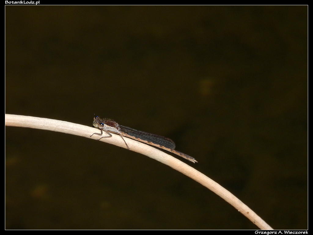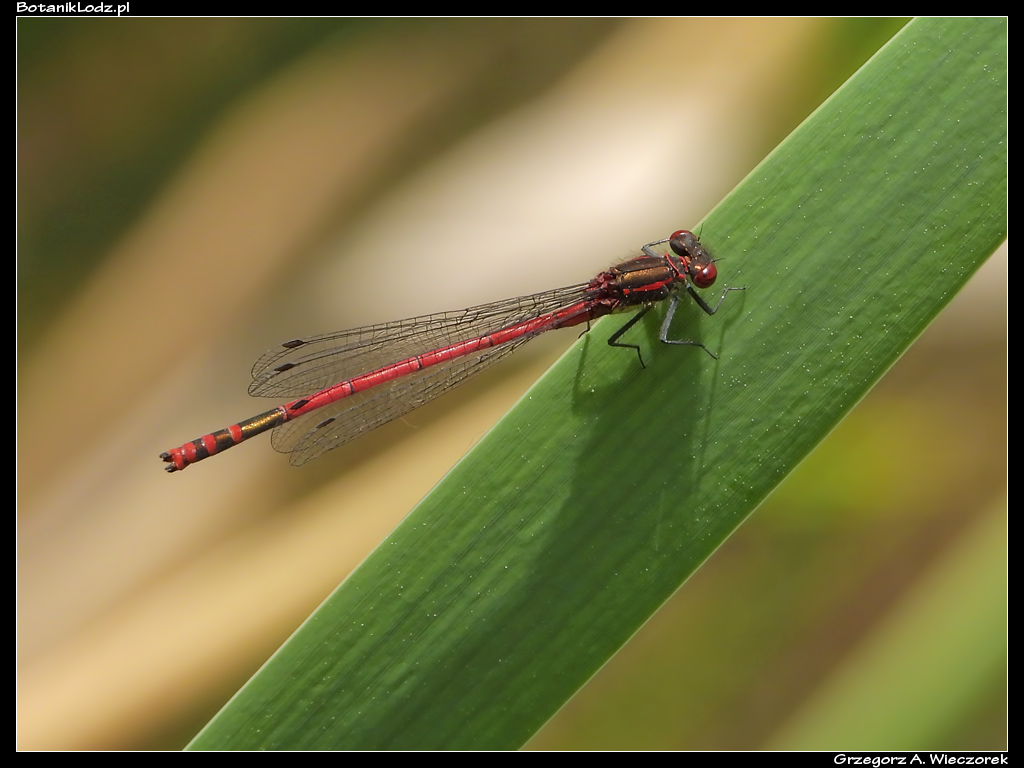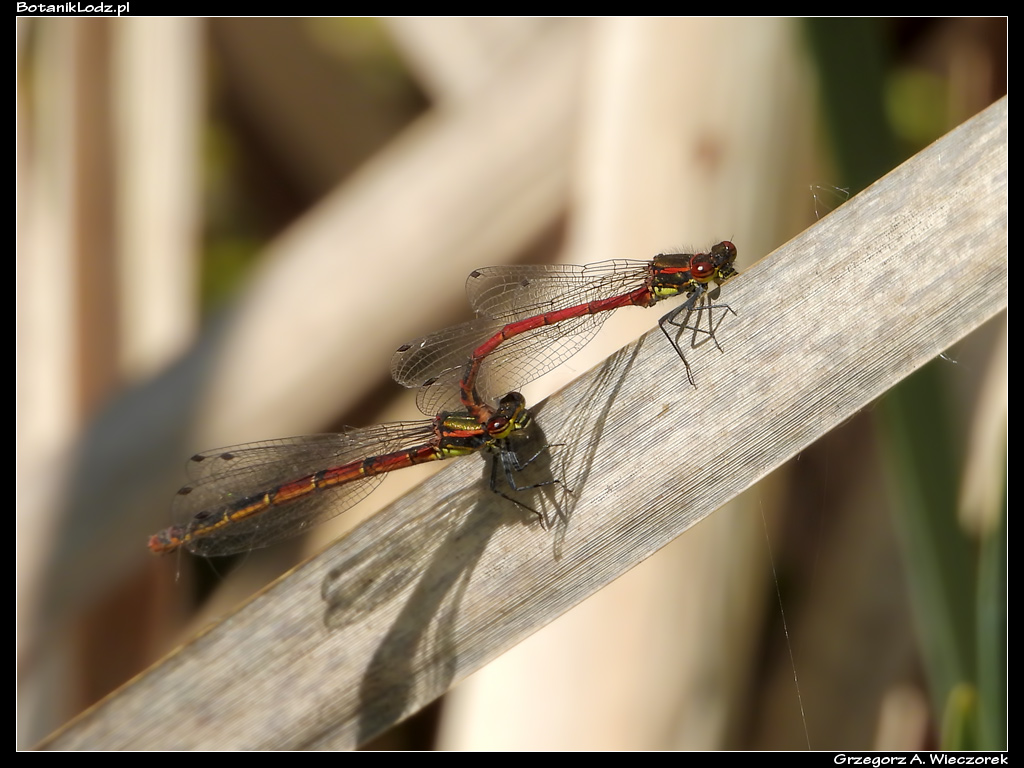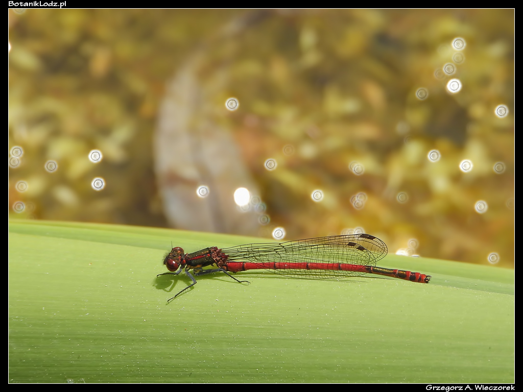 Zacznijmy od ważek, które są jednymi z moich ulubionych owadów. O tej porze roku zazwyczaj nad każdym stawem można spotkać ich setki, a Ogród naprawdę obfituje w ich liczne gatunki. Niestety, nie w tym sezonie. Wczodząc do Ogrodu od strony Retkini, zawsze skręcam w lewo i mijam pokaźny kompleks stawów położonych wśród rozległych łąk. Porastają je trzciny i inne wodne roślin, na brzegach pełno jest roślinności, wśród której buszują owady. Jednym słowem – prawdziwy raj dla ważek. Tymczasem w tym roku nie widziałem w tej okolicy ani jednego osobnika! Tak źle chyba jeszcze nigdy nie było. Nieco lepiej sytuacja wygląda na mniejszych zbiornikach wodnych w laskach bukowych. Tam udało mi się spotkać kilka razy łunicę czerwoną (Pyrrhosoma nymphula), pięknie ubarwiony gatunek, który widuję raz na kilka lat. Ważki te do tej pory widywałem na jednym ze stawów w Ogrodzie Japońskim, jednak ich okres występowania był na tyle krótki, że często – z powodu pogody czy braku czasu – nie widziałem ich w danym roku wcale. Tym razem łunice dopisały, są widoczne przez dłuższy czas i w innych miejscach. Udało mi się spotkać zarówno samce, jak i samice. Nie było ich dużo, ale kilkanaście osobników latających jednocześnie to i tak w tym kiepskim sezonie doskonały wynik.