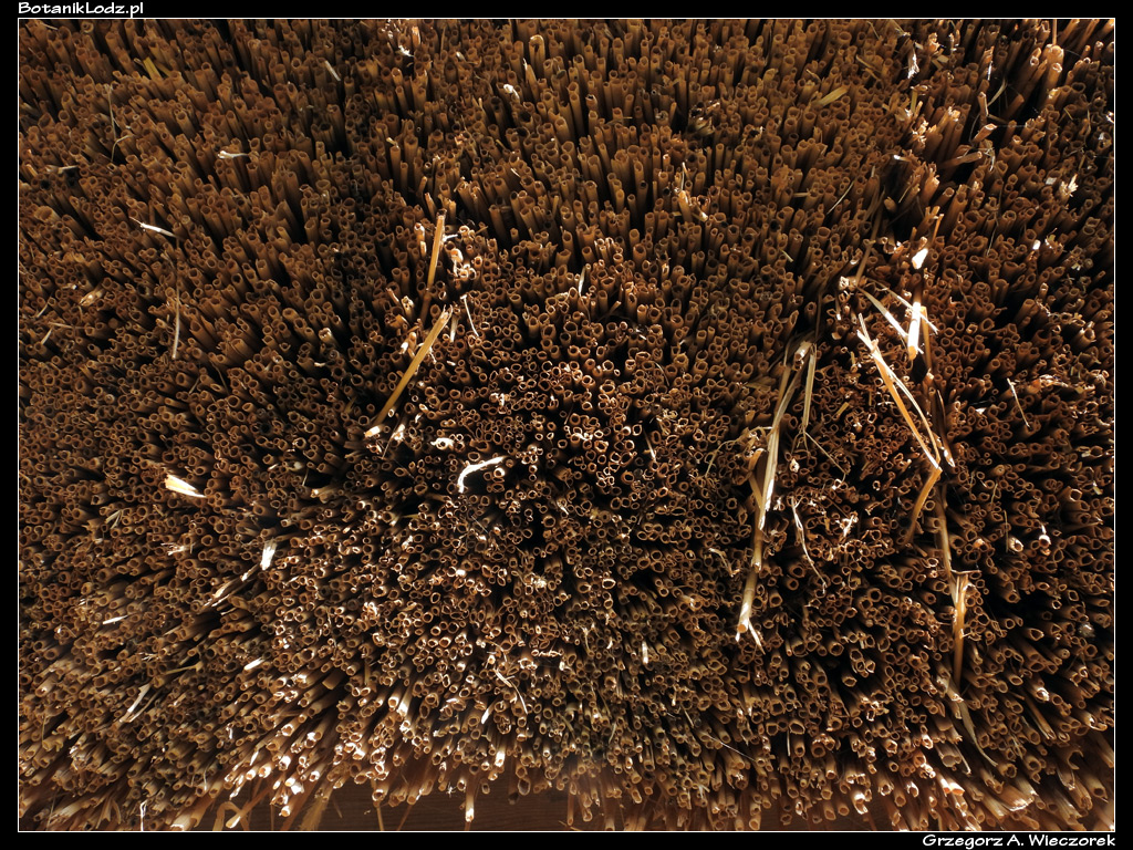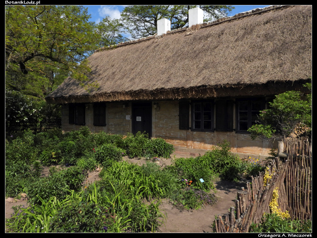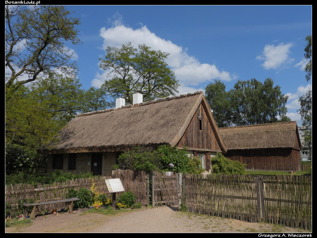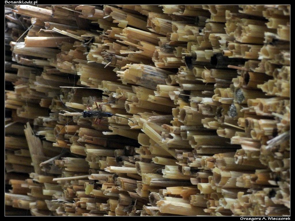 Ponieważ jesteśmy blisko skansenu, warto przyjrzeć mu się bliżej, ponieważ doznałem w nim objawienia. Nie miało ono jednak charakteru religijnego, a przyrodniczy. Patrząc na znajdujący się tam wiejski dom doszedłem nagle do wniosku, że przecież mam oto przed sobą największy w Botaniku domek dla owadów. I nie jest to wymysł, a historyczna prawda. Przez wieki wiejskie domy w naszym kraju, podobnie zresztą jak i inne zabudowania gospodarskie, były kryte strzechami. A taka strzecha to nic innego jak przycięta słoma czy podobny materiał, powiązany i położony na budynku. Zbudowany jest z tysięcy rurek z naturalnego materiału i o różnych średnicach. Przez setki lat takie strzechy występowały powszechnie, stanowiąc bazę do budowy gniazd dla wielu owadów. Zastąpienie dachów słomianych konstrukcjami z twardszych i nowocześniejszych materiałów przyczyniło się do znacznego ograniczenia miejsc lęgowych i stopniowe zanikanie niektórych gatunków. Według danych znalezionych w sieci, na metrze kwadratowym tradycyjnej strzechy można zmieścić od 150 do nawet 600 miejsc gniazdowych. Jej zaletą jest również wysoka retencja cieplna oraz przepuszczalność materiału zapewniająca wymianę powietrza. W czasie oględzin botanikowej chaty udało mi się zobaczyć kilka różnych gatunków błonkówek szukających bądź opiekujących się gniazdem.