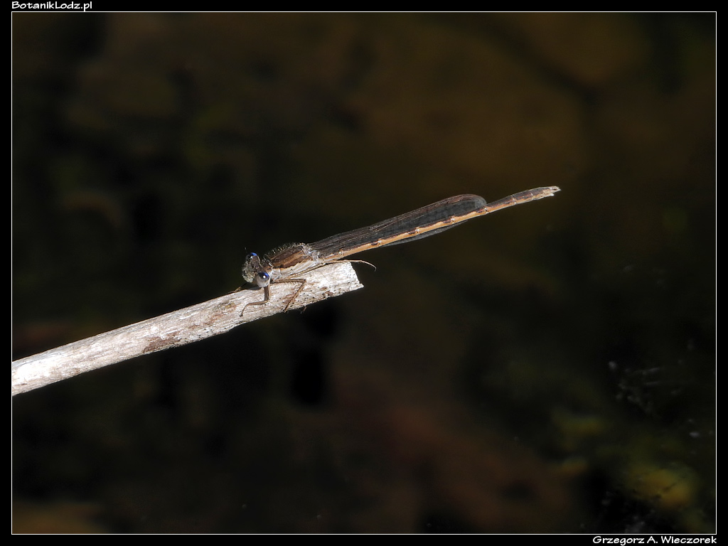 Kolejną mniej typową ważką jest straszka pospolita (Sympecma fusca). To gatunek powszechnie występujący w Ogrodzie, spotykany w różnych miejscach i dużej liczbie. Jego charakterystyczną cechą jest zimowa hibernacja – straszki są w stanie przeczekać niekorzystną porę roku, a wiosną pojawiają się nad stawami jako pierwsze. W sieci można też znaleźć ich niesamowite zdjęcia, na których siedzą na trzcinie, całe pokryte kryształkami lodu. Często zdarza się tak, że zanim Ogród zostanie na dobre otwarty, ważki te znikną już w coraz bujniej rozwijającej się roślinności. Ich brązowe ubarwienie jest przystosowane do wtapiania się w nadwodne tło złożone z suchych roślin i trzcin, dzięki czemu późną wiosną bardzo trudno jest je wypatrzeć. Tymczasem w tym roku większość botanikowych stawów została dokładnie ogolona z trzciny, nowe rośliny jeszcze się nie pojawiły z powodu ciągłego zimna i dzięki temu straszki są nadal widoczne. Spotykałem je przy każdej dotychczasowej wizycie i jak na razie to one stanowią najliczniejszą grupę tych drapieżników.
